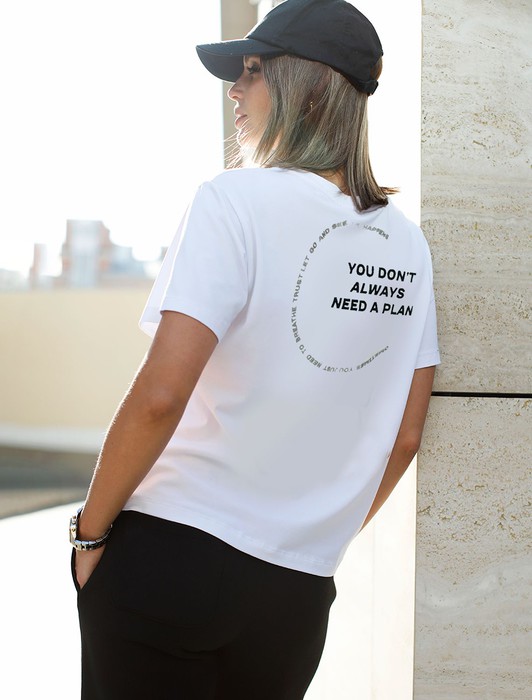 Состав: 92%Хлопок 8%ПУ Параметры модели на первом фото: Рост 170, бюст 89, талия 63, бедра 92Перевод надписи: «Не всегда нужен план. Иногда просто нужно сделать вдох, довериться, и ты увидишь, что произойдет» Футболка выполнена из премиального хлопка. Крупная надпись выполнена красками, маленькая - золотой фольгой с устойчивым покрытием. Наличие эластана в составе способствует комфорту и формоустойчивости, помогая сохранить изделие в течении долгого времени в идеальном состоянии. Модель дополнена фирменным металлическим логотипом бренда.