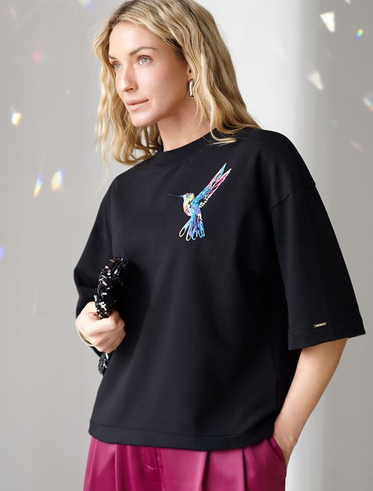 Состав: 95%Хлопок 5%ПУ Параметры модели на первом фото: Рост 170, бюст 89, талия 63, бедра 92Футболка выполнена из эластичного футера двухнитки, дополнена акцентной вышивкой на груди. Модель свободного кроя, по низу изделия дополнена хлопковым шнуром с металлической фурнитурой. Изделие сочетается в костюме с шортами D48.010, брюками D44.135 и D44.137