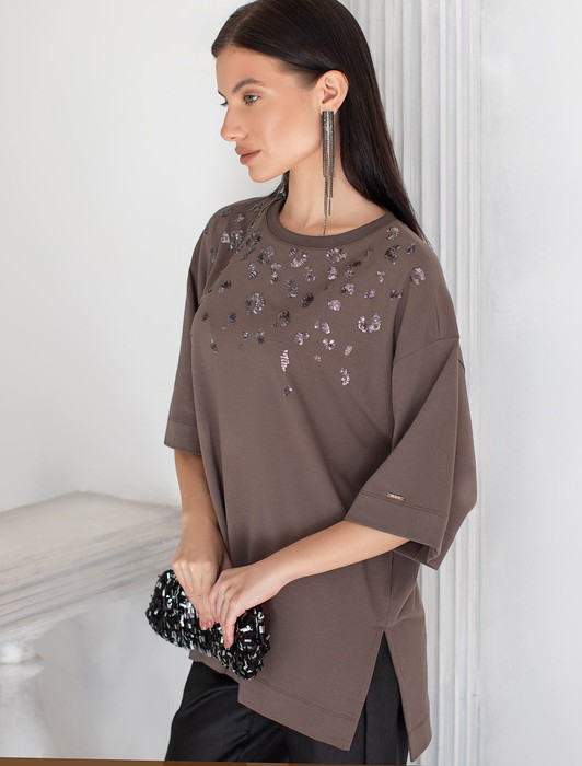 Состав: 92%Хлопок 8%ПУ Плотность: 170 Г/м2Оверсайз футболка кофейного цвета из премиального хлопка с добавлением эластана создана для комфорта и стиля каждый день. Натуральный материал приятный к телу, дышащая ткань хорошо держит форму и подходит для повседневной носки дома, в офисе или на прогулке. Классический свободный крой, удлиненный прямой силуэт и свободная посадка делают эту базовую футболку универсальным решением для любой фигуры и роста, включая плюс сайз размеры и беременных девушек, отлично скроет животик. Широкие рукава держат форму и подойдут на полные руки. Нарядная футболка украшена авторским принтом пайетками, которые создают красивый мерцающий эффект. Такой акцент делает модель уместной как для особых случаев, так и для ежедневных образов.