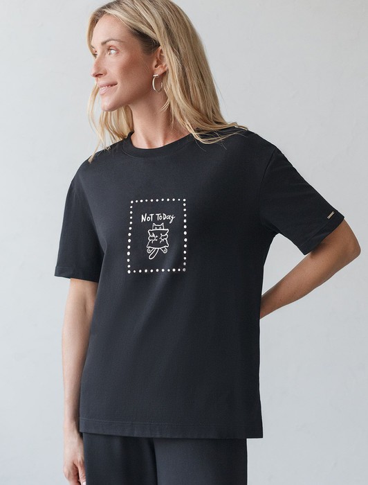 Особое внимание привлекает стильный принт в виде милого котика с минималистичной надписью. Перевод надписи: Not today - Не сегодня. Принт выполнен красками с устойчивым покрытием, который добавляет изделию оригинальности и позволяет выразить индивидуальность.