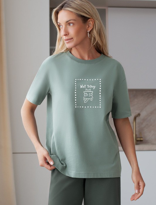 Особое внимание привлекает стильный принт в виде милого котика с минималистичной надписью. Перевод надписи Not today - Не сегодня. Принт выполнен красками с устойчивым покрытием, который добавляет изделию оригинальности и позволяет выразить индивидуальность.