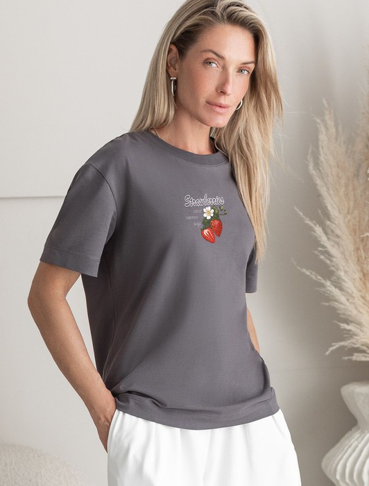 Особое внимание привлекает стильный принт в виде клубники с минималистичной надписью. Перевод надписи: Strawberries sweet summer days - Клубничные сладкие летние дни. Принт выполненны красками с устойчивым покрытием, который добавляет изделию оригинальности и позволяет выразить индивидуальность.