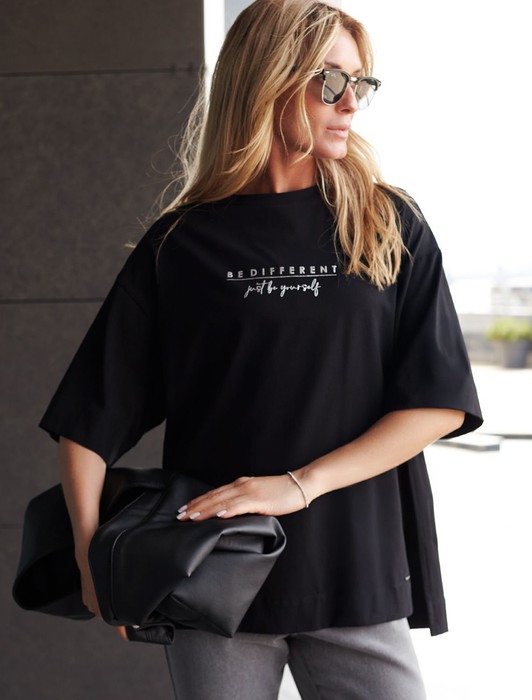 Состав: 92%Хлопок 8%ПУ Плотность: 170 Г/м2 Параметры модели на первом фото: Рост 172, бюст 88, талия 64, бедра 88Перевод принта: Be different, just be yourself - отличайся, будь собой. Футболка выполнена из эластичного хлопка. Авторский принт нанесен фактурной краской с устойчивым покрытием. Модель дополнена боковыми разрезами и фирменным логотипом бренда по низу изделия. Спинка немного длиннее. Свободный крой подходит для любой фигуры и не сковывает движений.