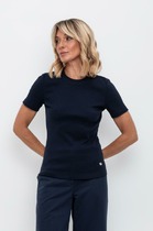 Футболка молодежная из гладкокрашенного полотна «кулирка с лайкрой», свободного покроя, со спущенной линией плеча, втачными рукавами длиной до локтя, горловиной овальной формы, обработанной втачной планкой. Изделие дополнено декоративной нашивкой, в боковых швах выполнены разрезы.