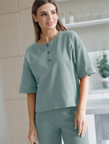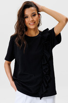 Футболка молодежная из гладкокрашенного полотна «кулирка с лайкрой», свободного покроя, со спущенной линией плеча, втачными рукавами длиной до локтя, горловиной овальной формы, обработанной втачной планкой. Изделие дополнено декоративной нашивкой, в боковых швах выполнены разрезы.