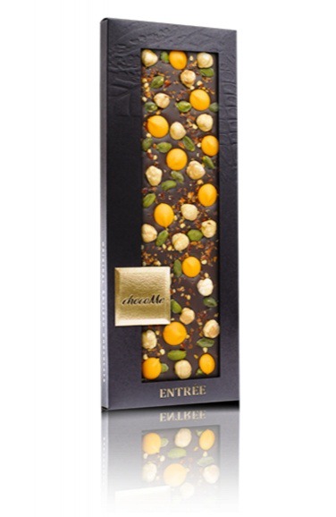 Горький шоколад ChocoMe с пьемонтским орехом, фисташками Бронте, апельсиновыми каплями и перцем чили.