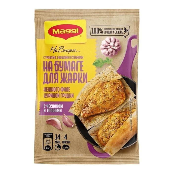 Оцените простой способ приготовления куриного филе всего за 14 минут в оригинальных листах для жарки Maggi На второе. Листы для жарки Maggi запечатывают соки внутри и наполняют куриное филе ароматом душистых трав и специй, что делает его удивительно вкусным. В комплекте идет пергамент для жарки без масла. 14 минут и готово. Без добавления масла. Сочное филе в ароматных специях.