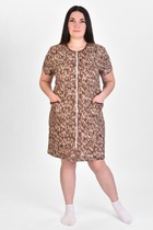 Клетчатый халат из набивной кулирки. На молнии спереди, без рукавов. По бокам два накладных кармана. Талия подчеркивается поясом. Две вариации расцветки — мелкая разноцветная клетка и крупная розово-темная. Размеры от 44 до 54. Внимание, товар не продается в розницу!