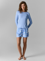 Стильный халат из кулирки. Застегивается на пуговицы, вертикальные белые и синие полосы, принт в виде насекомого и короны, имеются карманы, на спине бантовая складка общая длина приблизительно до середины бедра. Размеры от 46 до 58. Возможен розничный заказ данного товара.