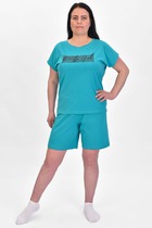 Халат из кулирки с рукавами чуть ниже локтя. На кнопках, низ и края рукавов отделаны белой оборкой. Две цветовых вариации — темно-синяя и бордовая. Размерный ряд от 44 до 54. Возможно приобретение в розницу.