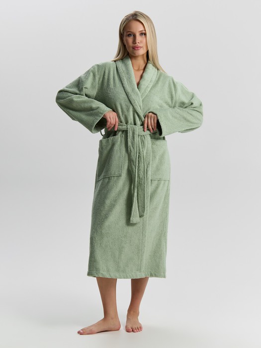 Женский халат из двустороннего махрового хлопкового полотна. Модель на запах, с поясом в шлёвках, с боковыми карманами, с воротником "шаль", с петлей-вешалкой по горловине спинки.
