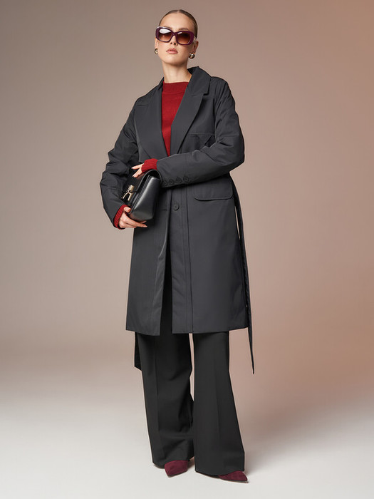 Утепленный классический плащ на пуговицах. Кокетка по полочке предает эффект вывернутого на изнанку изделия.