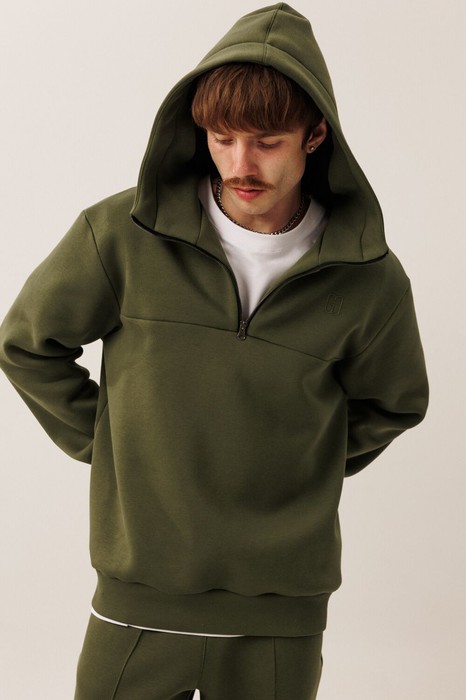 Этот джемпер от GOwear отлично подойдет для дома, прогулок, путешествий и отдыха. Сделан из теплой, комфортной ткани. Джемпер имеет двойной капюшон и короткую застежку - молнию черного контрастного цвета по центру переда. На переде с левой стороны выполнена вышивка в цвет ткани, а также расположена горизонтальная кокетка. Джемпер имеет прямой силуэт. Низ джемпера и манжеты выполнены из кашкорсе.