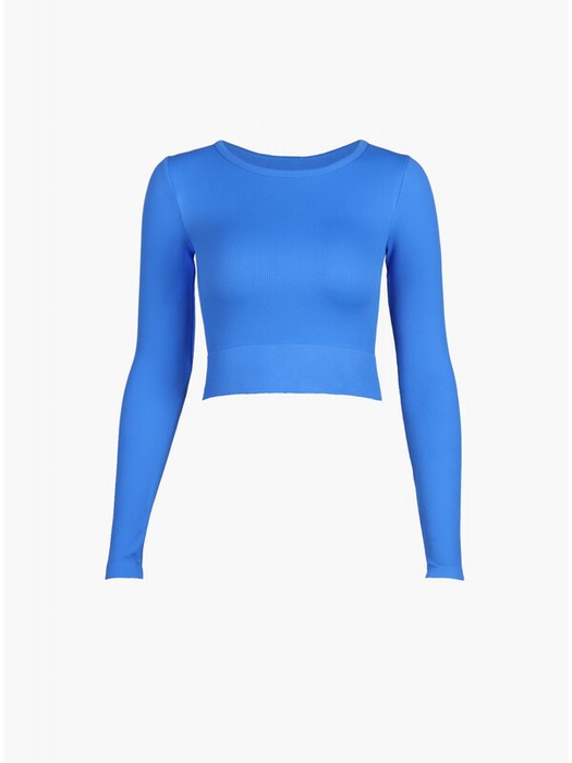 Лонгслив из полиамида, синего цвета, в рубчик, с длинными рукавами, облегающий, укороченный, на мягкой резинке.