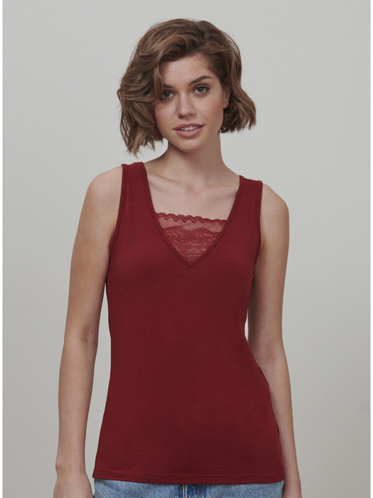 Майка из хлопка бордового цвета, с кружевной вставкой на вырезе, без рукавов, с V-образным вырезом, прямая, прилегающая.