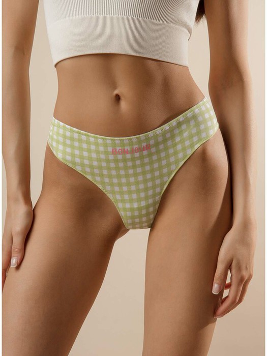 Трусы-стринги из хлопка, зеленого цвета с принтом, с кружевной частью сзади, на мягкой резинке, средней посадки.