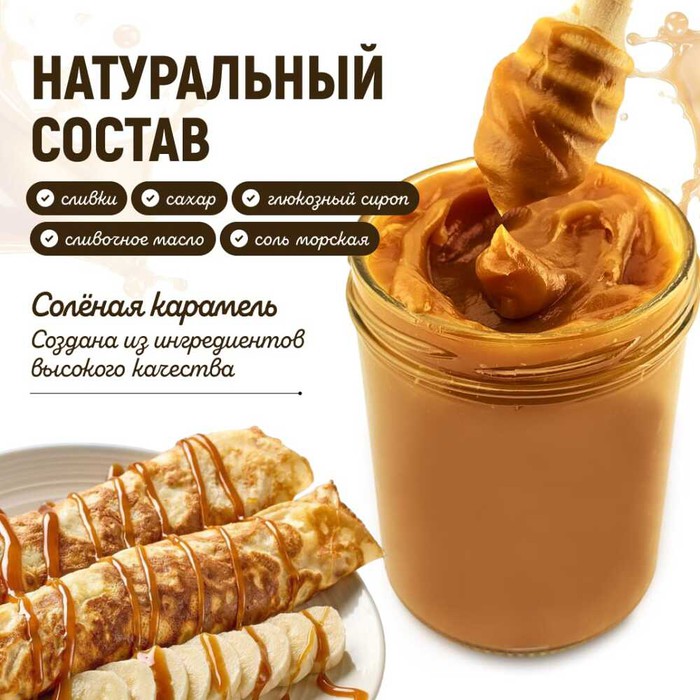 Соленая карамель отличается необычным сочетанием вкусовых качеств: приятной сладости и ненавязчивых соленых аккордов. Карамель можно использовать как самостоятельный десерт, топпинг для мороженого, добавку к кофе, сироп для коктейлей или карамель для торта. Пикантный вкус сладости к чаю не оставит никого равнодушным. Слегка соленоватый продукт идеально сочетается с пломбиром, ванильным кремом и кофе. Состав:сливки; сахар; глюкозный сироп; сливочное масло; соль морская