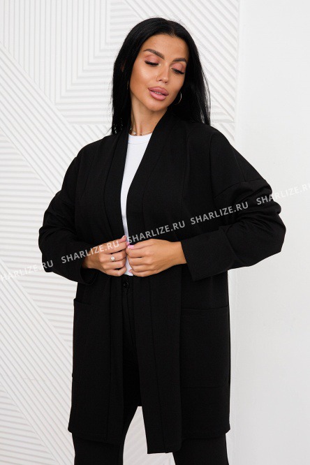 Женственный кардиган в классическом черном цвете из футера.Модель свободного силуэта, удлиненная спинка, спущенный рукав свободной формы.Кардиган отлично подойдет как для прогулок, так и для повседневного применения в прохладное время года.