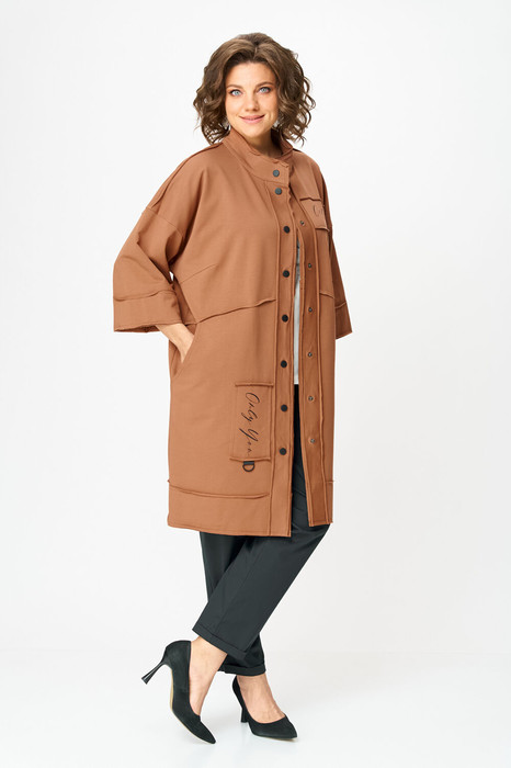 Кардиган женский прямого силуэта из трикотажной ткани (двунитка-футер). На полочке и спинке расположены декоративные, необработанные швы. В верхней и нижней части переда есть настрочные элементы с печатью и тесьмой. По переду изделия карманы. Спинка со средним швом и кокеткой. На кокетке расположен элемент с печатью и тесьмой. Рукав спущенный с манжетой. Вырез горловины оформлен стойкой. По переду изделия планка с кнопками.
