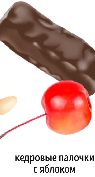 СОСТАВ: ядро кедрового ореха, ядро арахиса жареное, шоколадная глазурь (сахар, какао-масло, какао-порошок, эмульгатор лецитин), сахар, патока, яблоко сушеное.