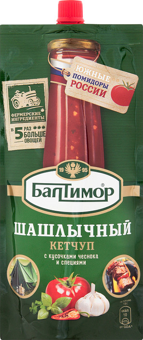 Густой кетчуп из отборных спелых помидоров со сладким и острым перцем, кусочками чеснока и зеленью.