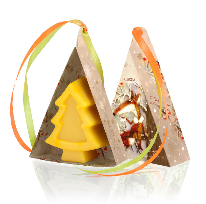 Мыло упаковано в подарочную коробочку, сверху закрыто прозрачной пластиковой крышкой.