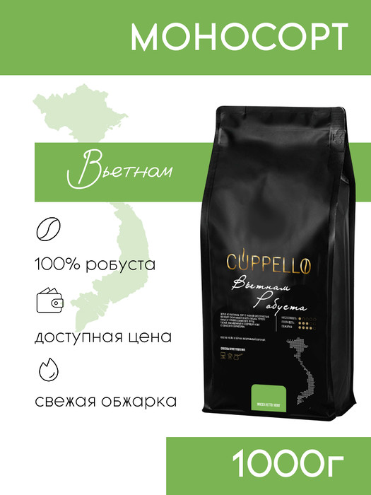 Состав: 100% робуста Вьетнам, кофе натуральный жареный в зёрнах.
