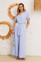 Комбинезон женский отрезной по линии талии, со спущенной линией плеча понизу с отделочной тесьмой «бахрама», с притачным поясом и съёмным завязывающимся поясом по линии талии. С застёжкой по среднему шву спинки на потайную молнию. Лиф переда на запах. Лиф спинки с талевыми выточками. Брюки расширенного силуэта, передние части с косыми боковыми карманами, задние с талевыми выточками.