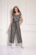 Комбинезон свободного силуэта со спущенным плечом и застежкой на потайную тесьму молнию с переди. Вырез горловины круглый. Рукав втачной длинный. В боковых швах действующие карманы.