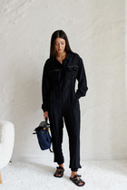 Комбинезон прямого, свободного силуэта, выполнен из однотонной ткани.  Полочка комбинезона с V-образной горловиной и застежкой в среднем шве на потайную молнию. Спинка со средним швом. Рукав короткий, цельнокроеный. В области бедер в боковых швах обработаны прорезные карманы. По талии комбинезон фиксируется поясом “кушак”. В нижней части комбинезна  половинки брюк  широкие, типа  “палаццо“.