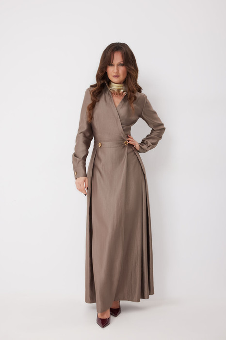 Комбинезон женский, отрезной по линии талии. Верхняя часть с рельефами по переду и вытачками по спинке. Воротник стояче-отложной. Застёжка на запах, на петли, пуговицы и потайную магнитную кнопку. Рукав втачной длинный, заканчивается манжетой с застежкой на петли-пуговицы. Нижняя часть комбинезона со складками и имитацией запаха. В боковых швах карманы. По спинке резинка на уровне талии.