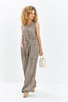 Комбинезон женский, отрезной по линии талии. Верхняя часть с рельефами по переду и вытачками по спинке, что обеспечивает стройность фигуры. Воротник стояче-отложной. Застежка на запах с петлями, пуговицами и потайной магнитной кнопкой обеспечивает практичность и легкость в использовании. Рукав втачной, короткий. Нижняя часть комбинезона оформлена складками и имитацией запаха, что добавляет модели свободы движений. В боковых швах расположены карманы. По спинке на уровне талии есть резинка для хорошей фиксации. Этот комбинезон идеально подходит для повседневной носки и разнообразных образов, сочетая модный стиль, комфорт и практичность.