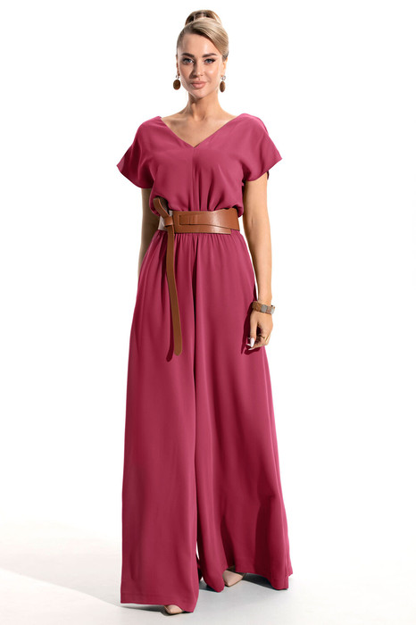 Комбинезон с центральной застежкой на потайную молнию в среднем шве спинки, без воротника, с V-образным вырезом горловины. В боковых швах расположены карманы. Комбинезон без рукавов, со спущенным плечом, разрезом по плечевому шву. Комбинезон отрезной по линии талии, шов по талии присборен на резинку. Комбинезон со съемным поясом.