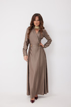 Комбинезон женский из штапеля, свободного силуэта, со спущенной линией плеча, с втачным поясом на уровне линии талии, в который вставлена эластичная тесьма. Лиф детали переда комбинезона со средним швом, на уровне талии обработаны 2 складки. Нижние части с рельефными швами, которые заканчиваются разрезами, в боковых швах обработаны наклонные карманы. Лиф детали спинки комбинезона с запахом, вверху которого обработан разрез с застежкой на 1 навесную петлю и пуговицу, по середине застежка на 1 потайную кнопку. На нижней части по шву притачивания пояса обработаны по одной вытачке на каждой половинке. Рукава втачные двухшовные, короткие, с разрезами. Вырез горловины комбинезона «V-образной» формы, обработан обтачкой.