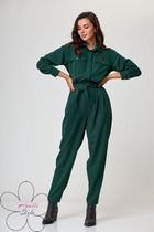 Комбинезон полуприлегающего силуэта с расширенными книзу брюками из трикотажного полотна “замша”. Горловина-стойка, по центру застежка на молнию. Рукав со спущенной линией плеча, по низу эластичная тесьма(резинка). По переду и спинке в районе талии притачной пояс, в пояс вставлена эластичная тесьма(резинка). По переду накладные карманы с клапанами. Брюки прямого силуэта, по переду  и спинке карманы. По низу брюк предусмотрена кулиса с завязкой для регулирования степени прилегания. Обращаем ваше внимание, что фурнитура может отличаться от фото.