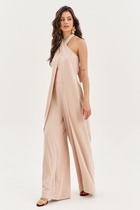 Комбинезон свободного силуэта из струящейся ткани, отрезной по линии талии и присобран на резинку. Вырез горловины округлой формы. В верхней части функциональная молния. Рукав спущенный, цельнокраеный, с притачным манжетом. По спинке средний шов. Низ брюк с фиксаторами, можно менять силуэт. В боковых швах карманы.