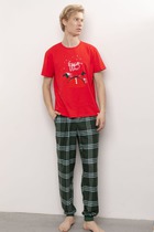 Мужской комплект состоит из фланелевых брюки и классической футболки. Брюки свободного прилегания с манжетой по