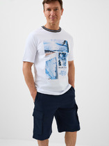 низу. В боковых швах удобные карманы. Футболка свободного прилегания из трикотажного хлопкового полотна. Вырез горловины круглый, по низу изделия брендовая нашивка.
