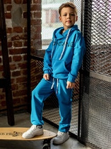 Комплект для девочек. Худи из футера оверсайз силуэта. Капюшон изнутри отделан декоративной тесьмой с вытканным рисунком, перевод Рождество. Линия плеча спущена, манжеты по низу рукавов и изделия из основной ткани. Rubber принт с золотом и глиттером. Перевод Волшебное Рождество. Брюки из футера умеренного объема с манжетами и поясом из основной ткани, карманы в боковых швах.