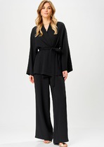 Блузка + топ. Блузка выполнена из органзы. Блузка прямого силуэта, длиной выше линии бедер. Перед и спинка цельные. Спереди прорезь. Воротник-стойка, переходящий в бант. Рукав втачной, одношовный, расширенный к низу и присборенный. Низ рукава на притачной манжете из отделочной ткани, застегивающейся на четыре пуговицы. В комплект входит топ из атласа. Топ на регулируемых бретелях. Перед и спинка топа цельные.