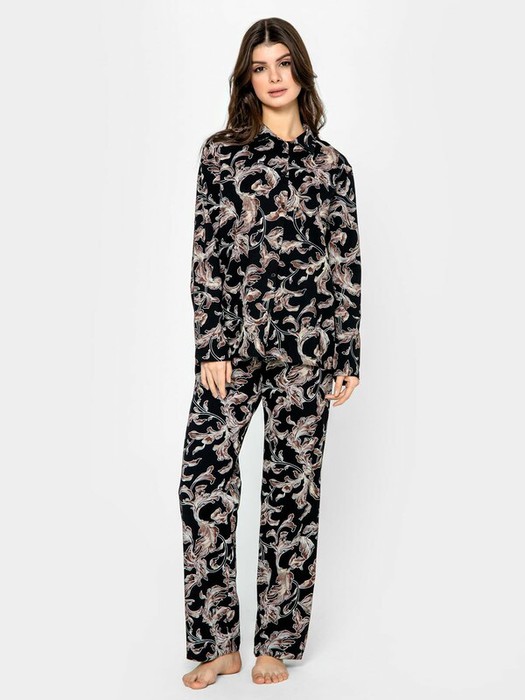 Комплект состоит из блузки и брюк, блузка на базе 592368. Силуэт блузки прямой и свободный, рукава длинные втачные, линия плеча немного спущена. Блуза с центральной застежкой на пуговицы, воротник стояче-отложной.Низ изделия и низ рукавов застрочен швом в подгибку.