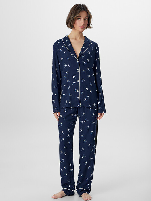 Жакет прямого силуэта длиной до середины бедер с V-образным вырезом и застежкой на пуговицы легко сочетается с разной домашней одеждой. Слегка спущенная линия плеча и длинные рукава с манжетами обеспечивают полную свободу движений. Брюки свободного кроя с эластичным поясом и манжетами по низу дарят ощущение невесомости, не стесняя движений во время сна или отдыха. Этот комплект станет идеальным спутником для спокойного сна, уютных вечеров с книгой и расслабляющих выходных.