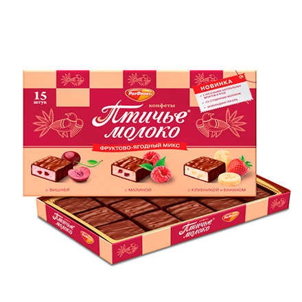 Конфеты «Птичье молоко» фруктово-ягодный микс - подарок, способный восхитить самого искушенного сластёну! Ассорти из 3 -х потрясающих потрясающих вкусов: вишня, малина, клубника и Банан. Плотные ряды покрытых темной шоколадной глазурью квадратиков. Под ее ломкой гладью – нежное суфле с кусочками натуральных фруктов и ягод.