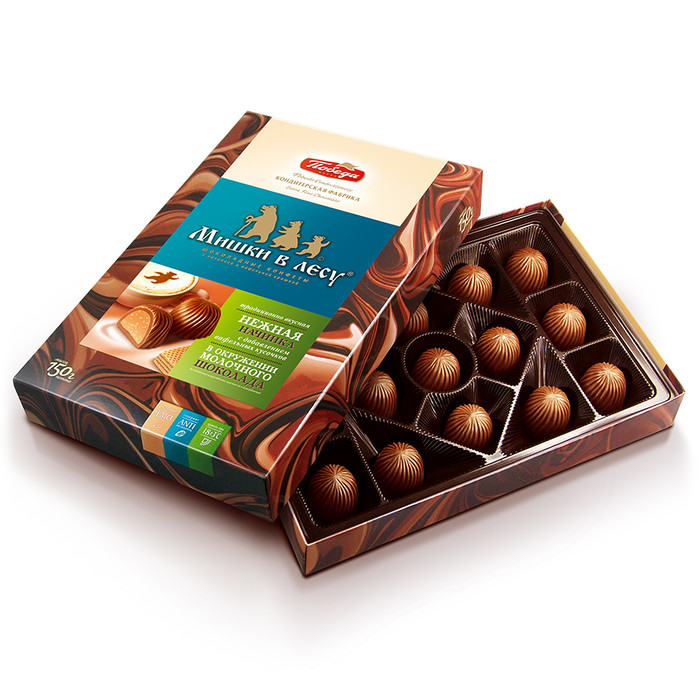 Конфеты «Мишки в лесу» на протяжении нескольких поколений являются символом семейного праздника и уютного чаепития в кругу самых близких. Рецепт этих шоколадных конфет от "Победы" – это насыщенная молочно-шоколадная начинка с хрустящим криспом в оболочке из нежного молочного шоколада.