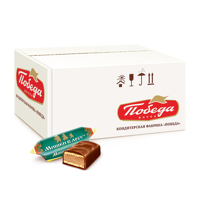Легендарные конфеты «Мишки в лесу» в новом прочтении фабрики «Победа». Традиционная конфета с шоколадной начинкой и хрустящей вафлей стала еще вкуснее в обрамлении насыщенного горького шоколада 72%.