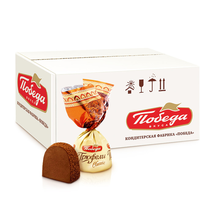 Классические трюфели «Победа» созданы по традиционному рецепту. Нежное «сердце» из сливок и шоколада усыпано ароматным темным какао. Трюфель – это «король» шоколадного мира, премиальный продукт с богатой историей, восходящей к французскому кондитерскому искусству 19 века. Эти конфеты обладают удивительной способностью мгновенно создавать вокруг себя атмосферу праздника