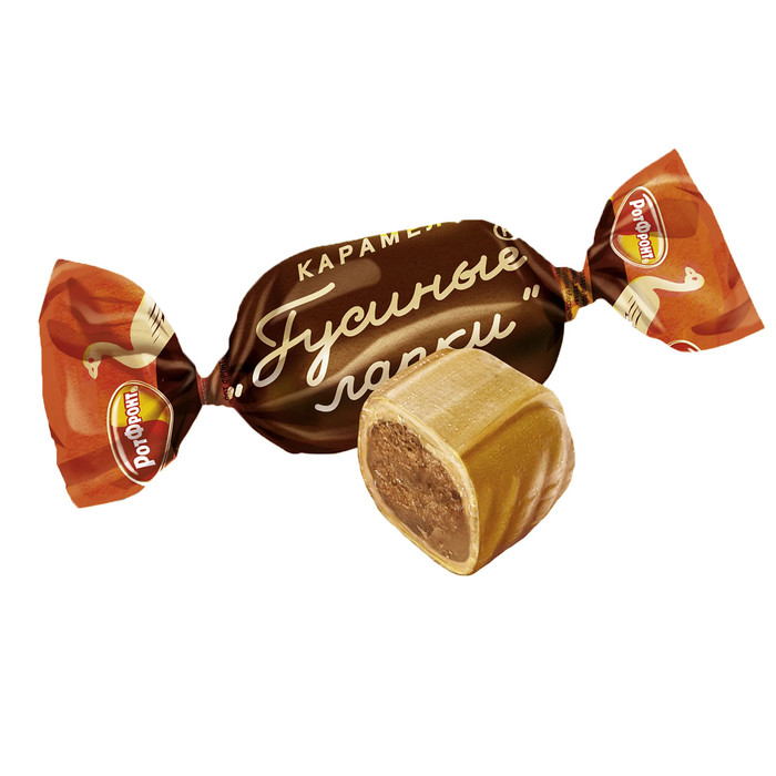 Знаменитые «Гусиные лапки» – карамельные конфеты с начинкой из ореховой помадки. Слоистая темная карамель с сахарным хрустом скрывает нежную тающую текстуру начинки с насыщенным вкусом арахиса и пряно-терпкими оттенками какао. Яркий карамельно-ореховый аромат, вкус, знакомый и любимый многими поколениями.