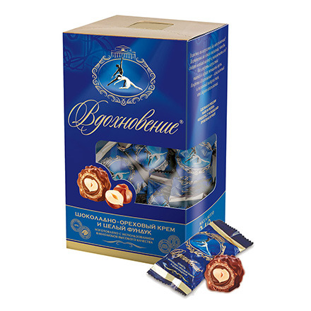 Конфеты «Вдохновение» с фундуком и шоколадно-ореховым кремом. Хрустящие шарики из тонких воздушных вафель, покрытые шоколадной глазурью с дробленым орехом. Внутри – цельное ядро фундука, окутанное нежным шоколадно-ореховым кремом. Презентабельная упаковка с прозрачной вставкой, сквозь которую видно конфеты в индивидуальных фантиках.