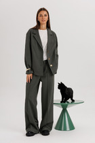 Костюм женский из кулирного полотна состоит из футболки и брюк. Футболка прямой силуэт. Горловина круглая, рукав короткий, втачной, низ изделия обработан на плоскошовной машине. Брюки прямые, верх на поясе с резинкой, в боковых швах внутренние карманы, низ изделия с манжетом. На полочке и передней половине брюк принт.