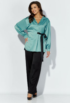 Костюм женский из кулирного полотна состоит из кофты и брюк. Кофта прямого силуэта, рукав-реглан длинный на манжете, горловина круглая, обработана окантовкой, низ изделия на поясе, на полочке принт. Брюки прямые, верх на поясе с резинкой, в боковых швах внутренние карманы, низ на манжете.
